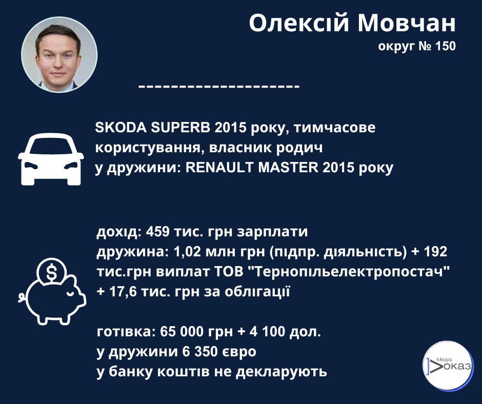 Народний обранець задекларував майже 459 тисяч гривень зарплати впродовж року роботи в Управлінні справами Апарату Верховної Ради України, ще 1 млн 25 тис. грн родина отримала завдяки підприємницькій діяльності Аліни Мовчан. Також у 2022 році вона отримала 192 тисячі гривень виплат від ТОВ “ТЕРНОПІЛЬЕЛЕКТРОПОСТАЧ” та 17,6 тисяч гривень – від Мінфіну за відчуження цінних паперів та корпоративних прав ( у 2021 році дружина народного обранця була власницею державних облігацій).