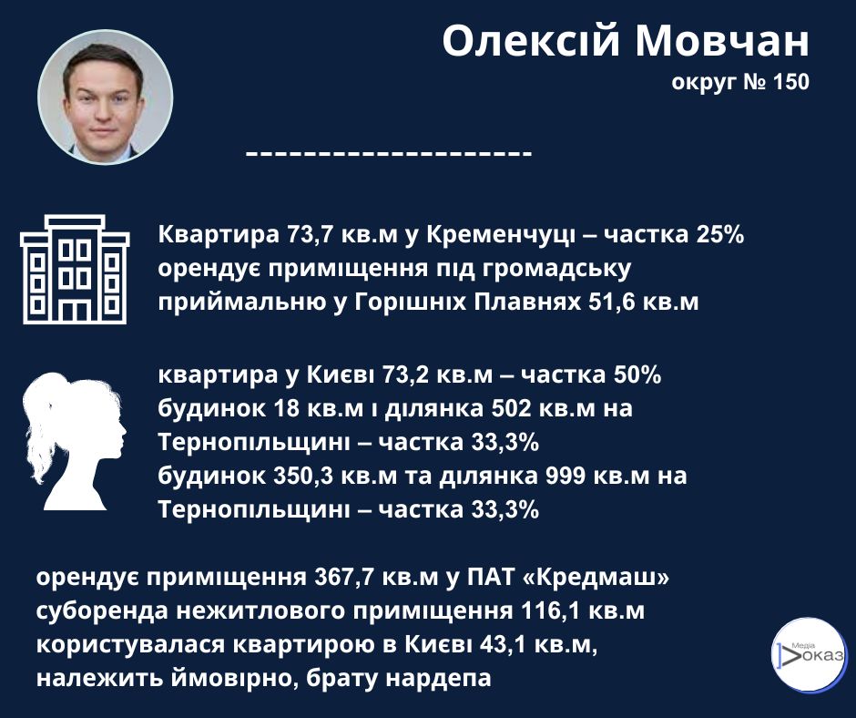 За 2021 рік нардеп задекларував у власності дружини об’єкт незавершеного будівництва – квартиру в Києві площею 82,78 квадрати. На кінець 2021 року розмір зобов’язань Аліни Мовчан складав 1 227 988 грн. Інформації про це помешкання у 2022 році немає.