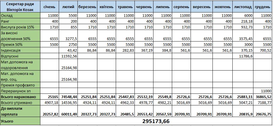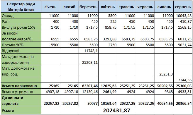 У запиті нам надали інформацію і про зарплату секретаря сільської ради Вікторії Козак. ЇЇ оклад – 11 тисяч гривень. Посадовиці доплачували 450 гривень за ранг та 1 717,5 гривень за вислугу років (до березня 2023 року було відповідно по 400 і 1710 грн). Також упродовж зазначеного періоду вона отримувала надбавку за високі досягнення у розмірі 50 % – це 6 583,75 грн. Щомісячна премія становить 5 500 (це 50% окладу).
