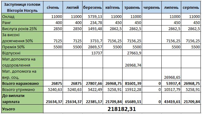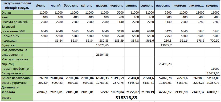 Середня зарплатня заступниці, з урахуванням сплати податків, складала понад 21 тисячу. Найбільша зарплата була у травні 2023 року – 65 689 грн, за рахунок оздоровчих та відпускних.