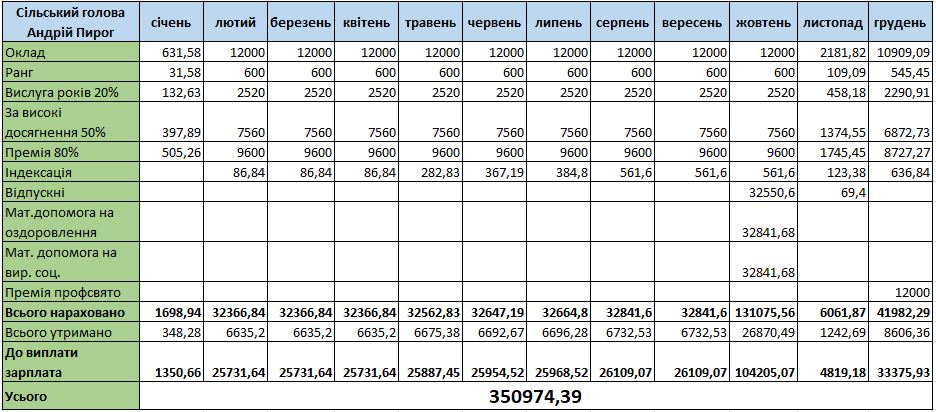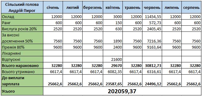 Впродовж 2022 року сільський голова отримував також надбавки: 600 грн за ранг, 2 520 грн за вислугу років, а також надбавку за високі досягнення у розмірі 50 % – 7 560 грн. Крім того, він щомісячно отримував премію у розмірі 9 600 гривень (це 80% окладу).