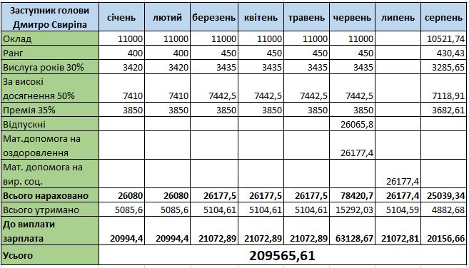 Дмитро Свиріпа отримує 3435 грн за вислугу років та 7 410 грн за високі досягнення (розмір цих доплат до березня 2023 року був дещо меншим). Розмір його щомісячної премії – 3 850 грн.