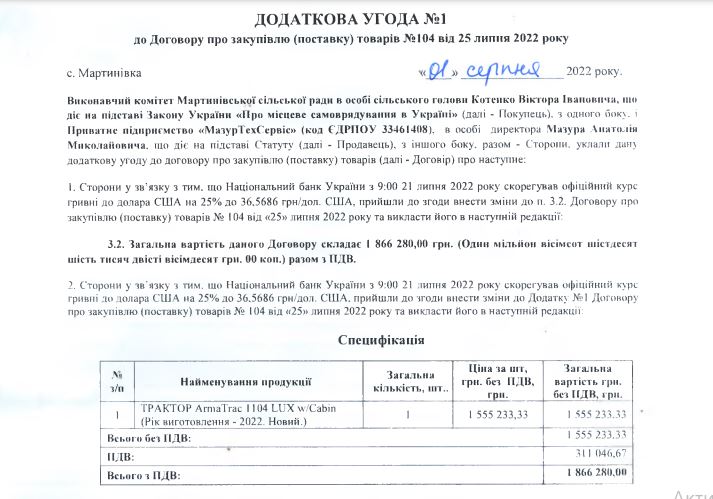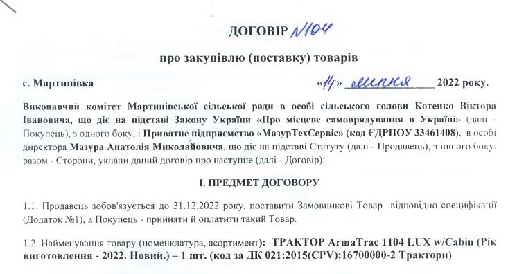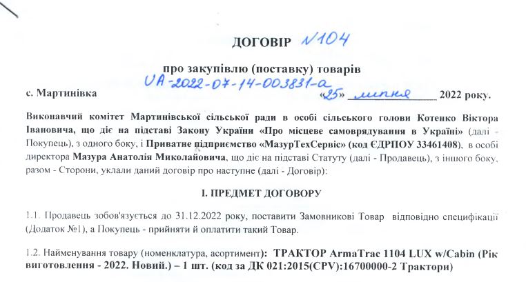 Договір, про який ймовірно йде мова, 14 липня 2022 року уклав виконавчий комітет Мартинівської сільської ради Полтавського району. Замовляли трактор АгmаТгас 1104 LUX w/Cabin 2022 року виготовлення. Підрядником за переговорною процедурою обрали ПП “МАЗУРТЕХСЕРВІС”, зареєстроване на Київщині.