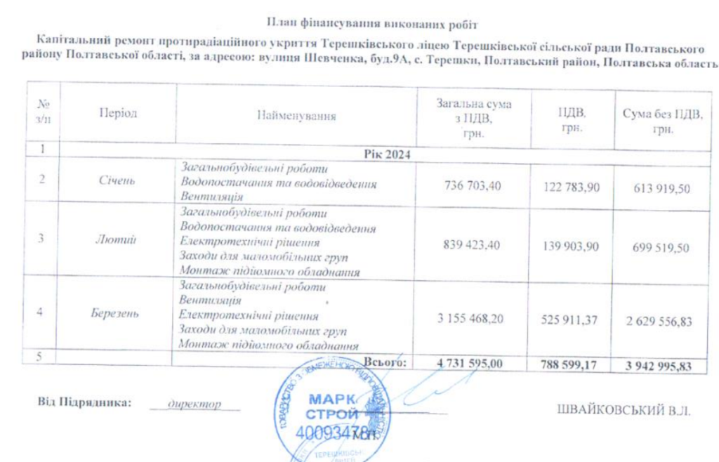 Вартість робіт становить 1 млн 736 тис. 905 грн. Угоду на додаткові роботи в ліцеї підписали без використання електронної системи закупівель. Договір уклали з тим же підрядником, з яким минулого року було підписано угоду на сам капітальний ремонт терешківського укриття.