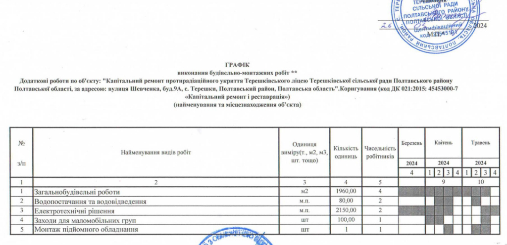 26 березня Терешківський ліцей Терешківської сільської ради замовив додаткові роботи з капітального ремонту протирадіаційного укриття. Про це повідомляється на сайті Prozorro.