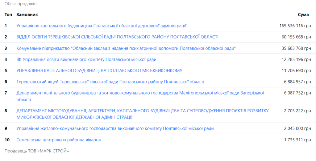 Найбільше підрядів, на суму більше 169 млн грн, фірма отримала від Управління капітального будівництва Полтавської обласної державної адміністрації. Про це вказують дані на Opendatabot.