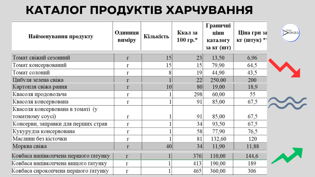 Ми проаналізували ціни з наданого товариством каталогу —  і тут без єдиної динаміки. Є як продукти харчування, вартість яких нижча, так і продукти за цінами вищими за граничні. Так само чимало позицій відрізняються від встановленої межі не суттєво, на копійки.