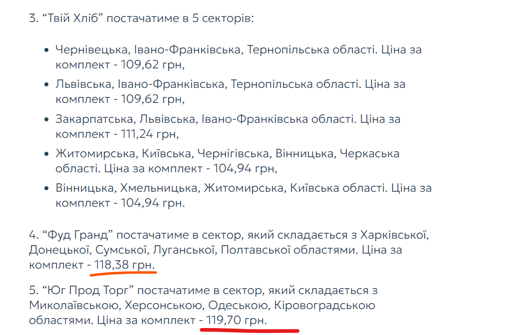 Ціна за комплект, що його постачатиме ТОВ “Фудгранд”, становить 118,38 грн. Вища вартість комплекту тільки в одного підприємства — “Юг Прод Торг” — 119,70 грн.
