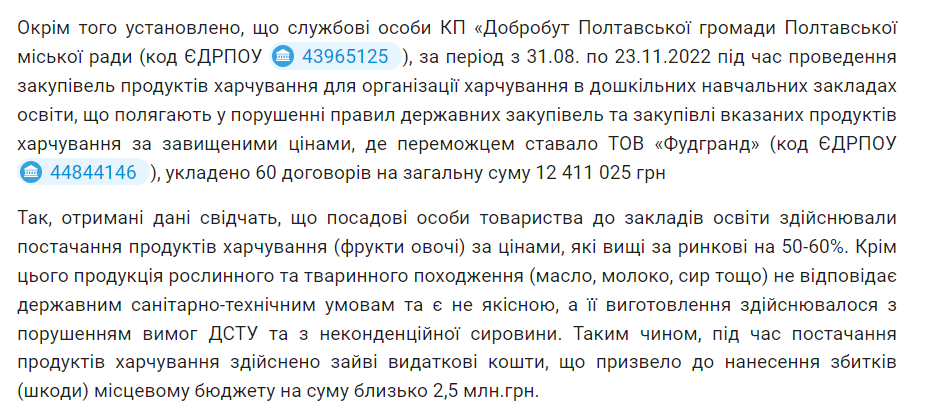 Прокуратура підозрює товариство в порушенні правил державних закупівель та у закупівлі продуктів за завищеними цінами. Мова про 60 договорів на загальну суму 12 411 025 гривень.
