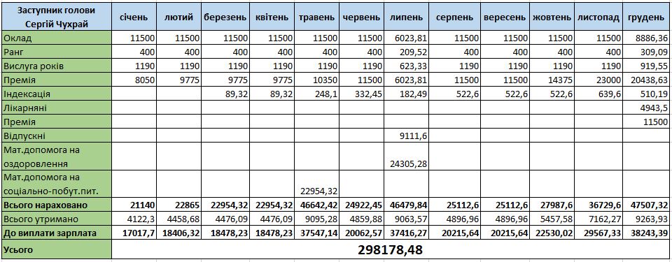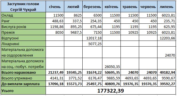 У голови Ланнівської сільради є заступник – Сергій Чухрай. Його оклад – 11 500 гривень. Йому нараховували надбавки за ранг та за вислугу років, доплати за виконання особливо важливої роботи немає.