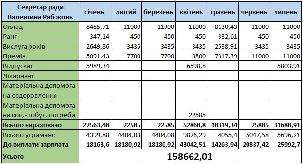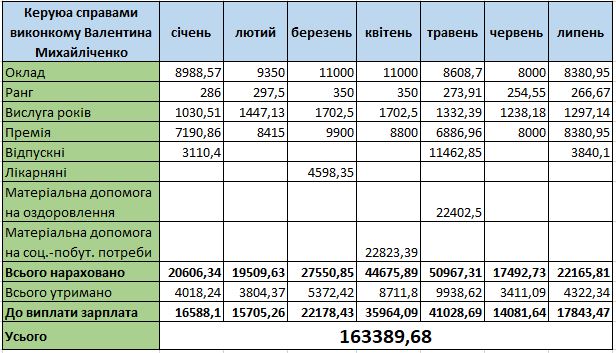 Керуюча справами виконкому Ланнівської сільської ради Валентина Михайліченко має оклад 11 тисяч гривень на місяць. Також упродовж зазначеного періоду їй виплачували доплати за ранг і за вислугу років.