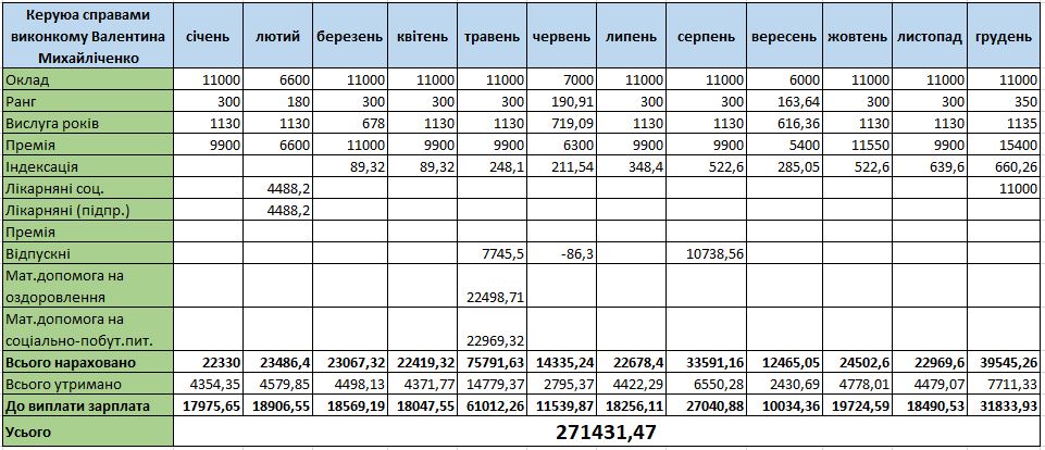 У 2022 році найбільша зарплата у керуючої була в травні 2022-го – понад 61 тисяча гривень – за рахунок відпускних і двох матеріальних допомог (на оздоровлення та соціально-побутової). У 2023 році матеріальну допомогу Валентина Михайліченко отримала у різні місяці: у квітні — 22 823 грн, у травні — 22 402 грн.