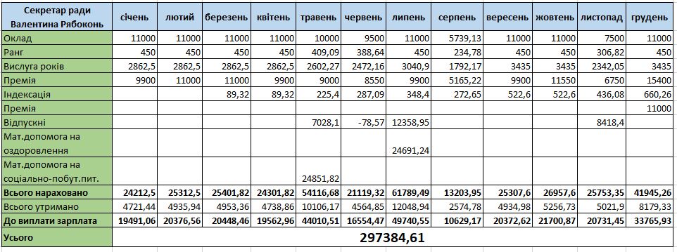 Секретар Ланнівської сільської ради Валентина Рябоконь має посадовий оклад 11 тисяч гривень і схожий перелік надбавок, що й в заступника голови, – за ранг та за вислугу років. Щомісячно чиновниця отримувала премію у розмірі від 7 700 до 15 400 грн, а також разову: у грудні 2022-го у розмірі посадового окладу.