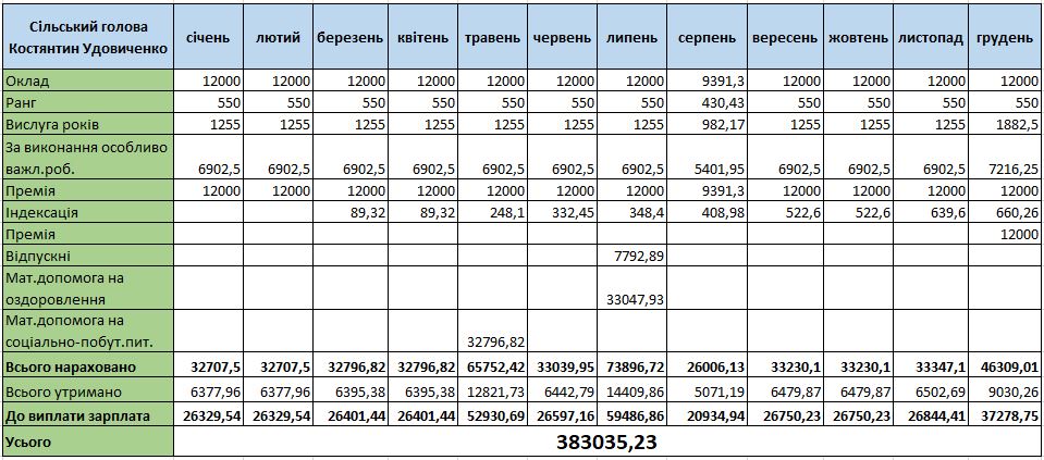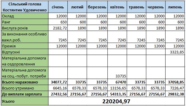 У середньому за місяць сільський голова отримував приблизно 27 тисяч гривень зарплатні з урахуванням сплати податків і зборів. Найбільша зарплатня була у липні 2022 року – 59 486 грн, коли він отримав оздоровчі та відпускні. Усього у 2022 році Костянтину Удовиченку виплатили 383 тис. грн зарплати.