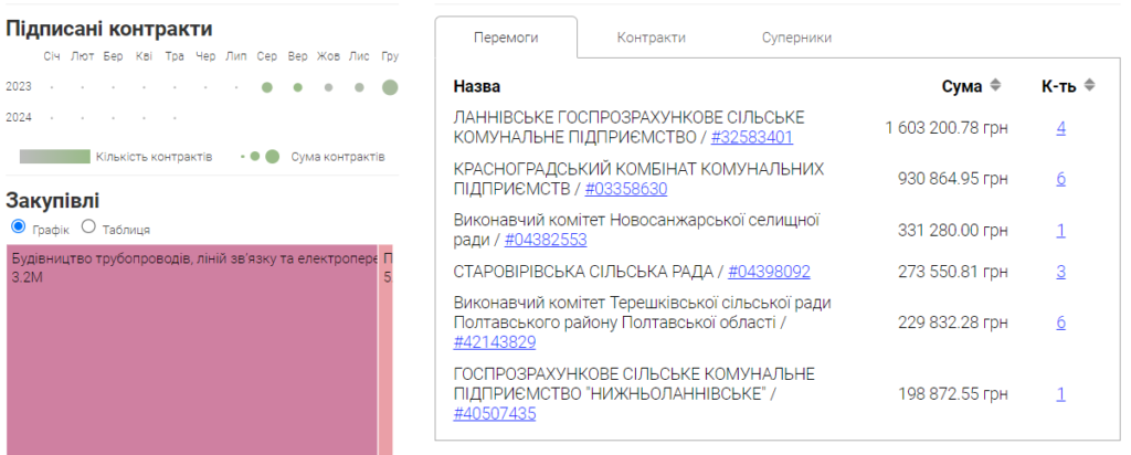 Головна спеціалізація підприємства – будівництво доріг і автострад. Тільки за минулий рік воно взяло підрядів на суму понад 18 млн грн. Обслуговувало сільські ради та комунальні підприємства Полтавщини та Харківщини. За весь час, за даними Clarity Project, компанія підписала 126 договорів на суму 42,97 млн грн. У цьому році ПП не уклало жодної державної угоди.