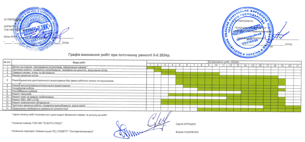 Календарним графіком передбачено: підготовчі та гідравлічні роботи, огляд і обстеження, ремонт арматури котла і двостороннього димососа, пальників, опор, підвісок трубопроводу, ремонт електричного обладнання і гідравлічні випробування.