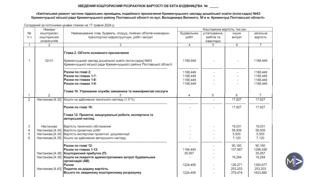 У зведеному кошторисі на 1,6 мільйонів закладено роботи з проєктування та експертизи, які логічно можна викреслити, але тоді капремонт мав би коштувати 1,51 млн.
