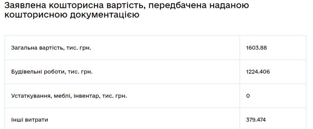 За оприлюдненим кошторисом, загальна вартість робіт мала б складати 1,6 млн, де 1,2 — будівельні роботи, а 379 тисяч —  інші витрати.