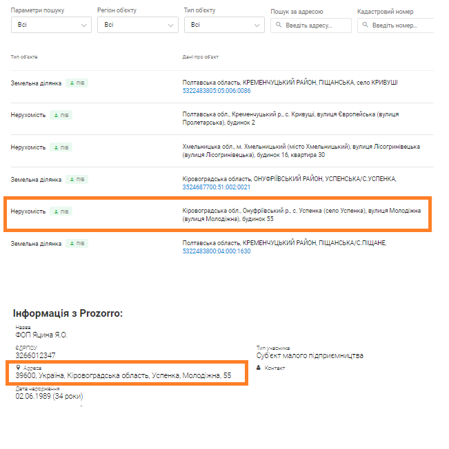Адреса реєстрації підприємниці вказана в нерухомості, яка раніше належала Яцині Олександру Павловичу.