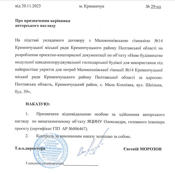 Комунальне підприємство розробляло проєктно-кошторисну документацію для облаштування укриттів у школах № 21 та № 14 (в останній мова йшла про будівництво модульної будівлі). Головним інженером та інженером-проєктувальником обох проєктів знову був Олександр Яцина. Його також призначили відповідальною особою за здійснення авторського нагляду по об’єкту у школі № 14.