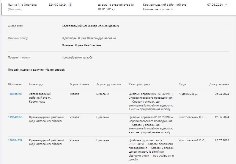 Крім того, у квітні 2024 року Яна Олегівна Яцина подавала заяву про розірвання шлюбу із Яциною Олександром Павловичем. У липні Кременчуцький районний суд залишив заяву без розгляду у зв`язку із примиренням заявниці з відповідачем.