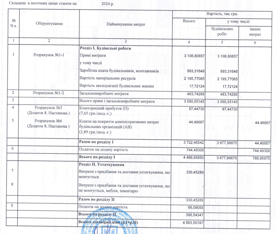 Згідно з договірною ціною, на прямі витрати зосереджено понад 3,1 млн грн, із яких 893 тис. грн – заробітна плата будівельників і монтажників, 2,1 млн грн – вартість матеріальних ресурсів, 17 тис. грн – вартість експлуатації будівельних машин тощо. Прибуток підрядника складе 87,4 тис. грн.