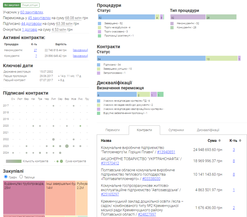 За даними clarity-project.info, ТОВ “Новобудова” взяло участь у 60 закупівлях, з яких 32 були неконкурентні. Кількість підписаних угод складає 44 на загальну суму 63,38 млн грн. Найдорожчі підряди фірма отримала від КВП “Теплоенерго” м. Горішні Плавні” (три на суму понад 24 млн грн). З КГЖЕП “Автозаводське” товариство співпрацює вперше.