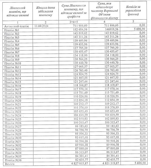 Графік передбачає, що після сплати авансу КП буде платити банку щомісячний платіж у розмірі від 143 до 82 тис. грн упродовж 36 місяців.
