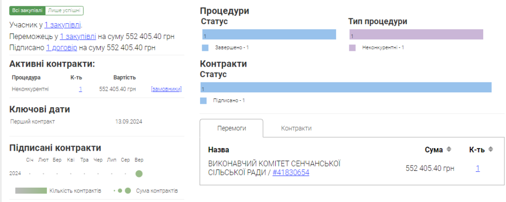 Договір на облаштування Алеї пам’яті став першою держугодою для Івана Захарченка, раніше він участі в тендерах не брав. Але за даними Єдиного порталу публічних коштів, 11 вересня підприємець отримав від виконкому Сенчанської сільради 990 грн за послуги з технічного обслуговування системи вентиляції в адміністративній будівлі.
