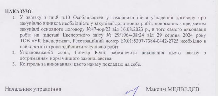 Закупівлю провели без торгів, мотивувавши необхідністю проведення додаткових робіт на об’єкті на підставі експертного звіту ТОВ «УК Експертиза» від 29 серпня 2024 року.
