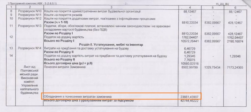 В день укладання 10-мільйонної угоди на коригування будівництва, Управління також підписало додаткову угоду по основному договору. Його загальну вартість була зменшено з 61 млн 118 тис. млн до 42 млн 744 млн грн.