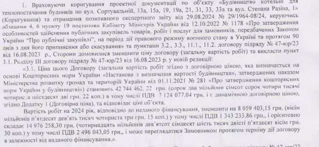 У додатковій угоді від 16 вересня вказано, що вартість обладнання для котельні обійшлася підряднику у 23,66 млн грн. Якщо продуктивність котельні складає 1,8 МВт, то, виходячи із суми обладнання, її питома вартість – 13,15 млн грн за МВт.