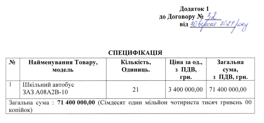 Згідно з угодою придбали автобуси ЗАЗ А08А2В-10, 2024 року випуску, на дизельному двигуні, з механічною коробкою передач. Колір кузова жовтий, із написами на боках “Шкільний автобус”. Робоче місце водія обладнане звуковою сигналізацією “Прошу зупинитись”.
