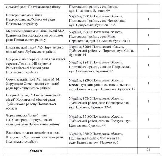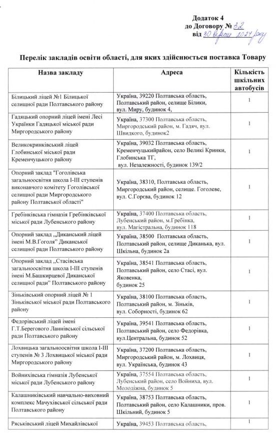 Постачання товару має бути здійснено до 30 листопада 2024 року. Автобуси отримають конкретні навчальні заклади у Білицькій, Гадяцькій, Глобинській, Гоголівській, Гребінківській, Диканській, Зіньківській, Ланнівській, Лохвицькій, Лубенській, Мачухівській, Михайлівській, Нехворощанській, Новосанжарській, Пирятинській, Решетилівській, Семенівській, Хорольській, Чорнухинській та Чутівській громадах.