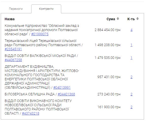 Майже через два тижні після реєстрації компанія почала отримувати бюджетні замовлення від полтавських розпорядників коштів. Найперше – на 1,38 млн грн від Департаменту будівництва та містобудування Полтавської ОВА. Загалом із компанією було підписано 12 договорів на суму 7,25 млн грн. Усі було отримано на безконкурентній основі.
