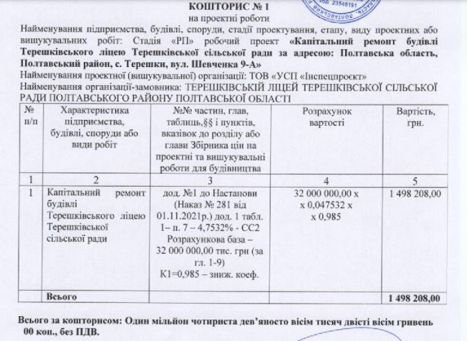 На розробку проєкту з капремонту Терешківського ліцею витратять майже півтора мільйони