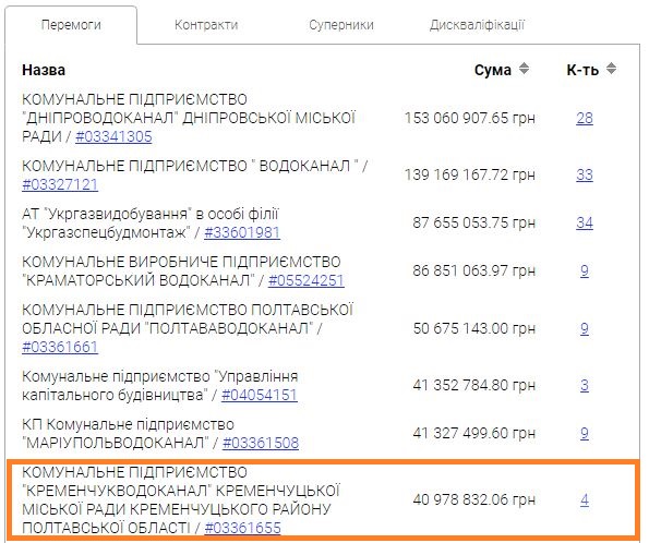 Згідно з даними аналітичної системи Clarity Project, з компанією підписано 194 договори на бюджетні замовлення на суму 855,12 млн грн. Найбільше – 123 угоди – із КП «Дніпроводоканал».