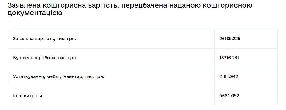 Після коригування загальна вартість капітального ремонту спортивної школи будівлі склала 26,16 млн грн: з них будівельні роботи – 18,3 млн грн, устаткування та меблі – 2,18 млн грн, інші витрати – 5,66 млн грн.