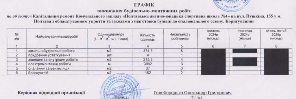 Спочатку полтавське управління капбудівництва оголосило підряд на ремонт спортшколи вартістю 18 млн грн. За ці кошти потрібно було облаштувати укриття та підготувати будівлю до опалювального сезону. Зокрема, облаштувати стелю, стіни та підлогу в укритті, а також відремонтувати вхідну частину із встановленням пандуса. Крім того, підрядник повинен відремонтувати будівлю школи (замінити перекриття, облаштувати стіни, підлогу та стелі, встановити опалення тощо). Строк виконання – до 28 лютого 2025 року.
