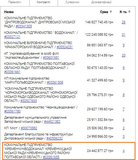 Згідно з даними аналітичної системи Clarity Project, з компанією підписано 198 договорів на бюджетні замовлення на суму 868.23 млн грн. Найбільше – 123 угоди – із КП «Дніпроводоканал».