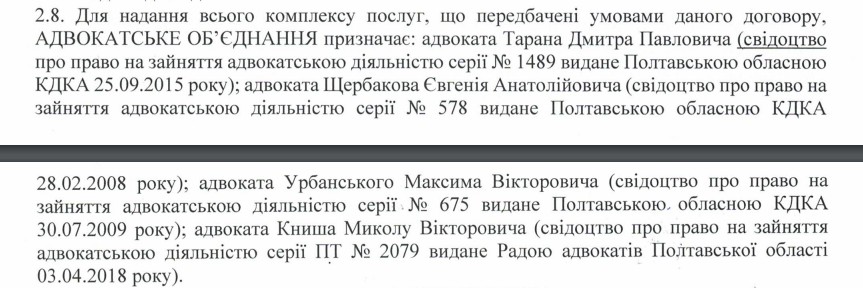Угоду підписали з ТОВ Адвокатське об’єднання “Юридична компанія “Кредо”. За даними аналітичного порталу Youcontrol, фірма зареєстрована майже 7 років тому в Полтаві зі статутним капіталом 1000 грн. Головна спеціалізація – діяльність у сфері права. Також фірма займається орендою, діяльністю у сфері бухобліку тощо.