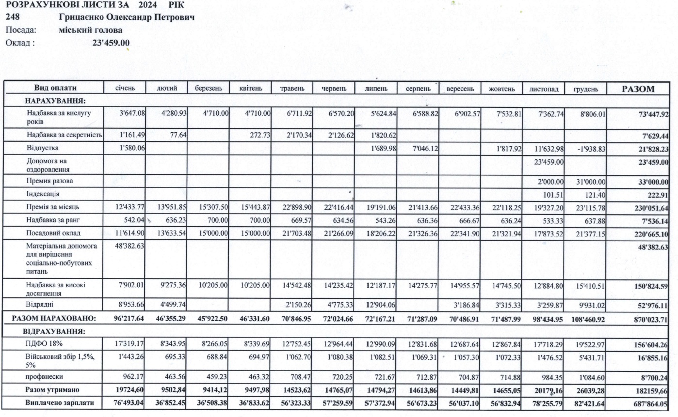 У таблиці наводимо виплати Олександра Грицаєнка із січня по грудень 2024 року.