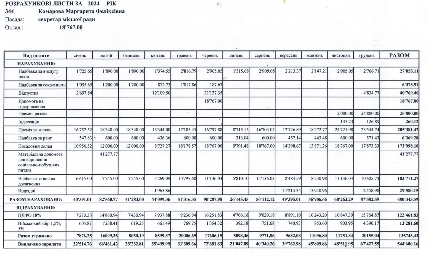 Середньомісячна зарплатня чиновниці становить понад 45 тисяч гривень (з урахуванням сплати податків). Загалом за рік Маргарита Комарова отримала 544 тисячі гривень.