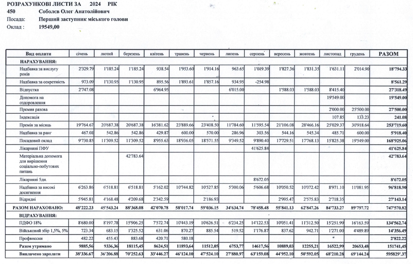 У березні Олег Соболєв отримав матеріальну допомогу у розмірі 42 783 грн, а також оздоровчі у листопаді – 19 549 грн.