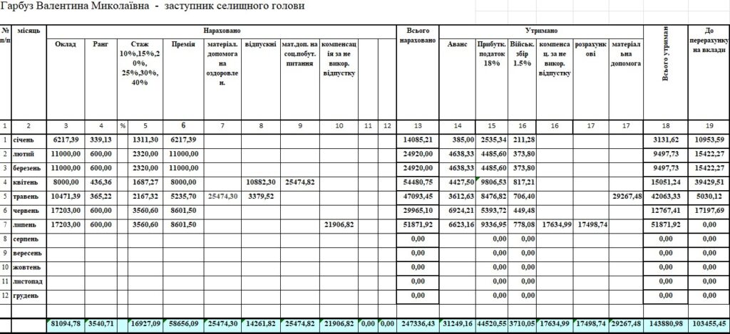 З відповіді на запит відомо, що Валентина Гарбуз у минулому році працювала на посаді з січня по липень. У неї були доплати за стаж і ранг. Розмір премії до травня дорівнював окладу, потому став 50 % від окладу.