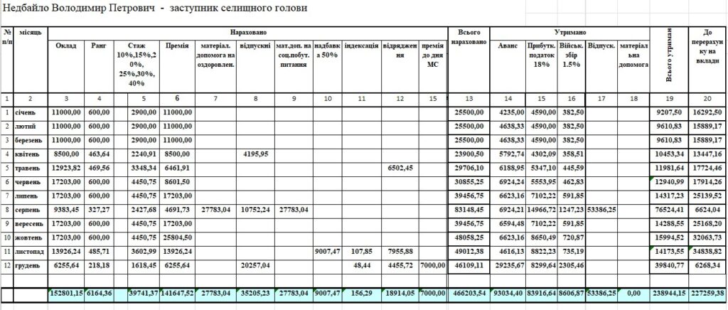 Загалом у 2024 році Володимиру Недбайлу нарахували 466 203 грн, виплатили – 303,7 тис. грн.