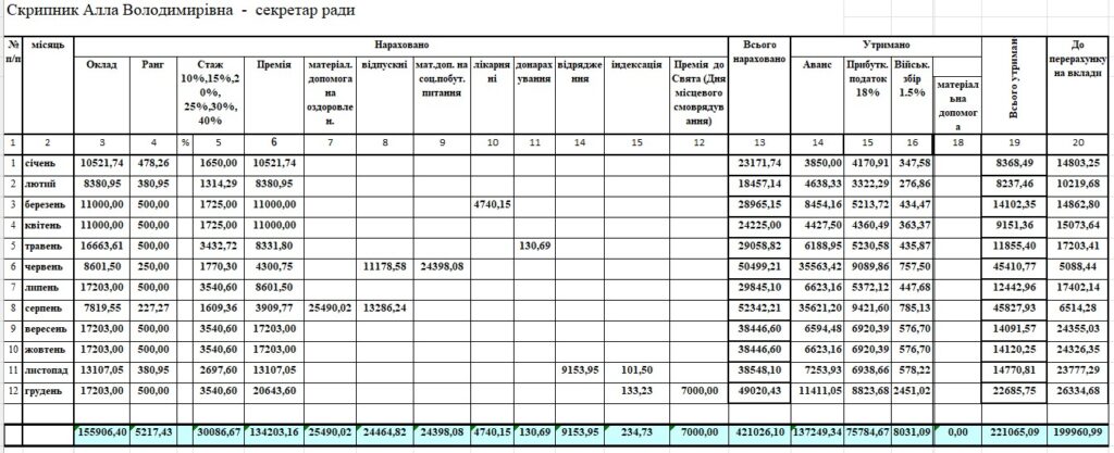 Загалом у минулому році секретарю ради нарахували 421 026 грн, виплатили – 337 210 грн.