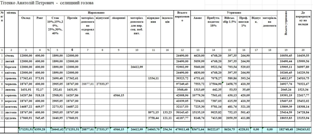 Найбільшу зарплату очільнику селищної ради нарахували у червні – понад 97 тисяч, за рахунок відпускних та оздоровчих, на руки виплатили майже 78 тисяч.