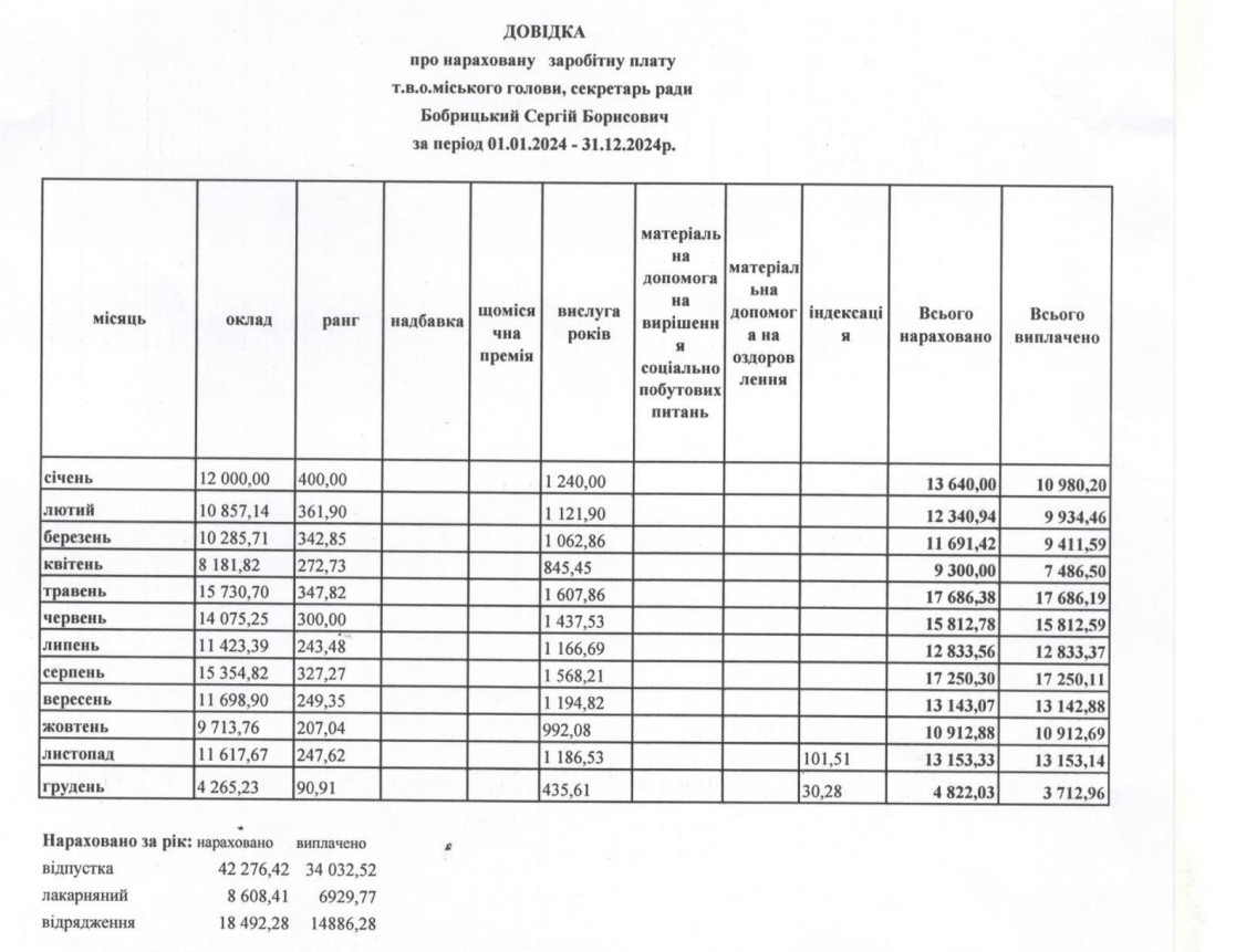 Загалом у 2024 році Сергію Бобрицькому нарахували 221 963 грн, з яких виплатили 198 165 грн.