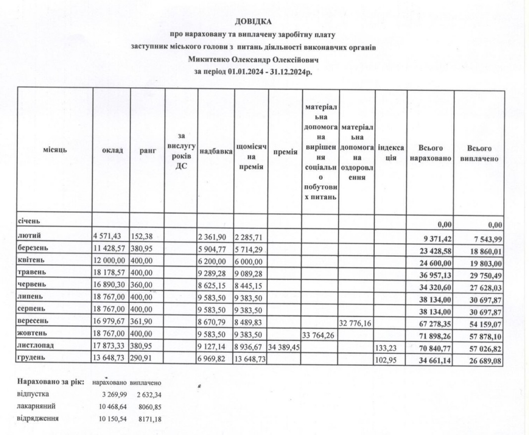 Загалом у 2024 році Олександру Микитенку нарахували 473 513 грн, на руки він отримав 379 598 грн.
